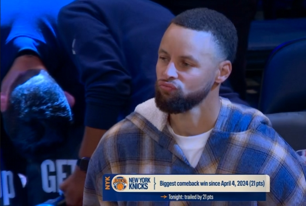 在库里看到波杰姆斯基的关键三分没能命中后他嘟嘴沮丧,他太想登场帮助这支球队但无能为力。